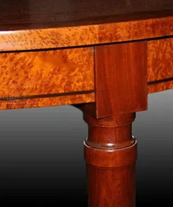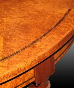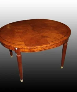 Bellissimo Tavolo ovale allungabile francese di metà 1800, stile Luigi XVI, in legno di mogano e radica di maples. Presenta piano e fascia sottopiano completamente in radica di maples impreziositi da filettatura di intarsio in pregiato legno di palissandro; gambe in legno di mogano terminano con bicchierini (piedini) in bronzo dorato.