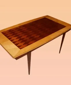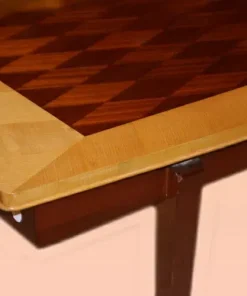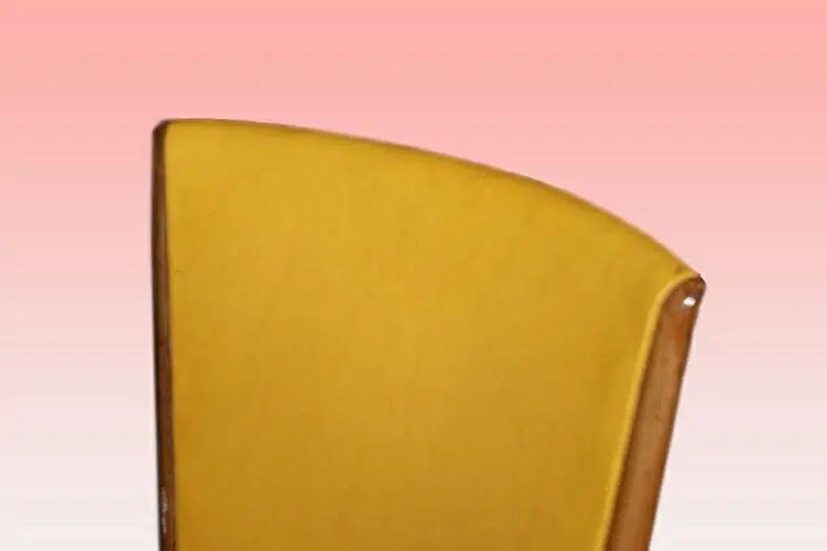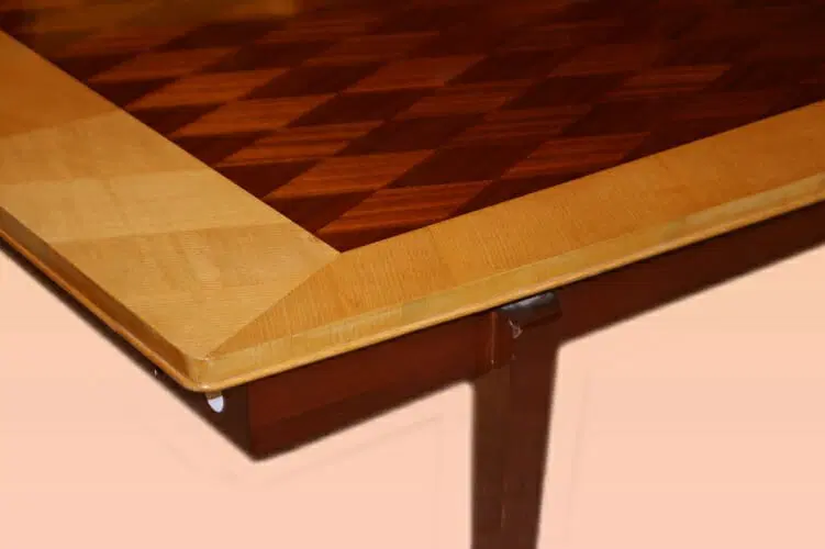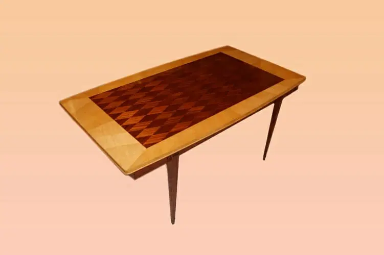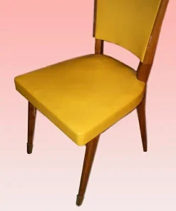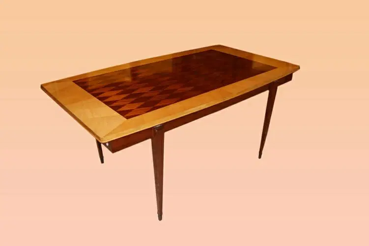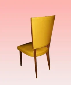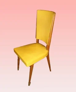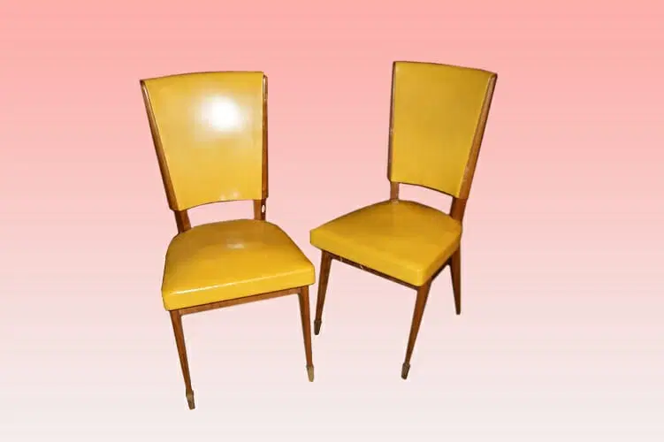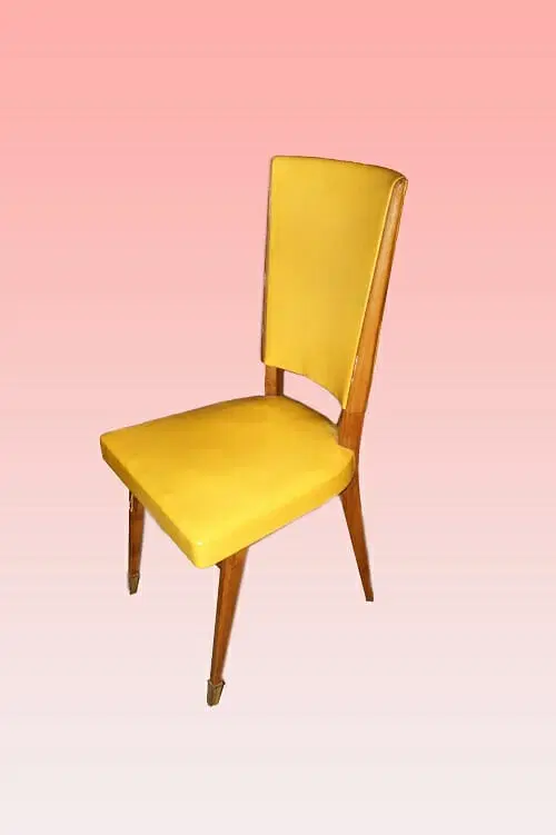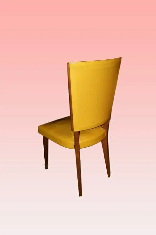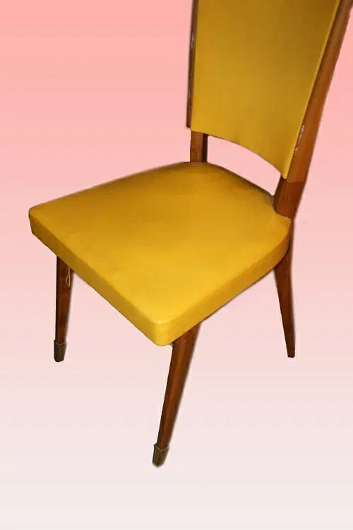 Tavolo con 6 sedie italiane di inizio 1900, stile Decò. Il tavolo è in legno di acero e mogano con piano parquettato dotato di 2 allunghe originali, le sedie sono in legno di mogano con seduta e spalliera rivestiti in similpelle di colore giallo.