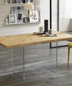 Tavolo da pranzo maestoso per le sue dimensioni e per la bellezza estetica tipica contemporanea. Infatti, il nostro tavolo moderno è allungabile passando da cm 200 a cm 300, grazie a due prolunghe laterali; formato da gambe in vetro e piano in legno finitura rovere, lavorato con bordo massellato, dettaglio che attribuisce un bordo irregolare e caratteristico. Disponibile anche la versione più piccola da cm 160 allungabile a cm 240.