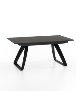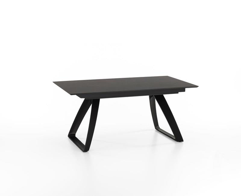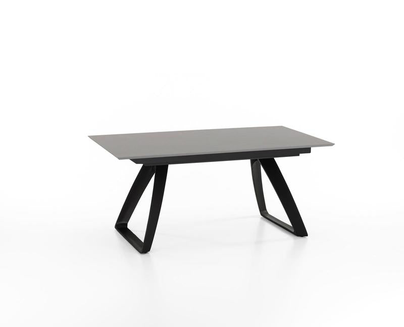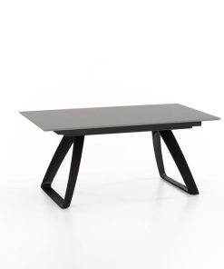 Tavolo design allungabile con gambe in metallo nero e piano in legno HPL, colore pietra grigio scuro.