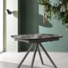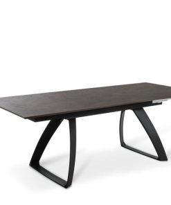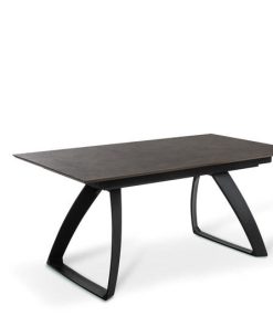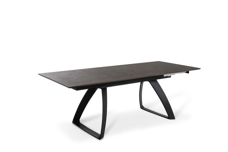 Tavolo moderno per sala pranzo lungo cm 170 ed estensibile fino a cm 270 con 2 allunghe alloggiate sotto il piano. Il tavolo design riprende una particolare forma delle gambe dalla forma triangolare realizzate in metallo colore nero. Il piano è prodotto in legno in una singolare finitura colore ruggine.