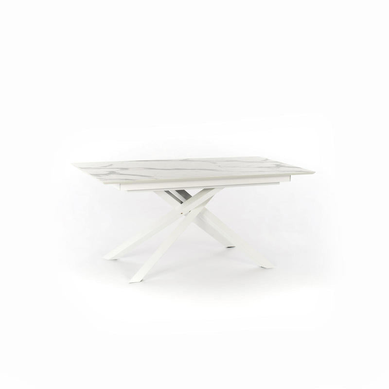 Tavolo design allungabile con due prolunghe riposte sotto il piano, elegante permezzo della finitura marmo calacatta che caratterizza il piano. Bellissime anche le gambe incrociate in metallo colore bianco.