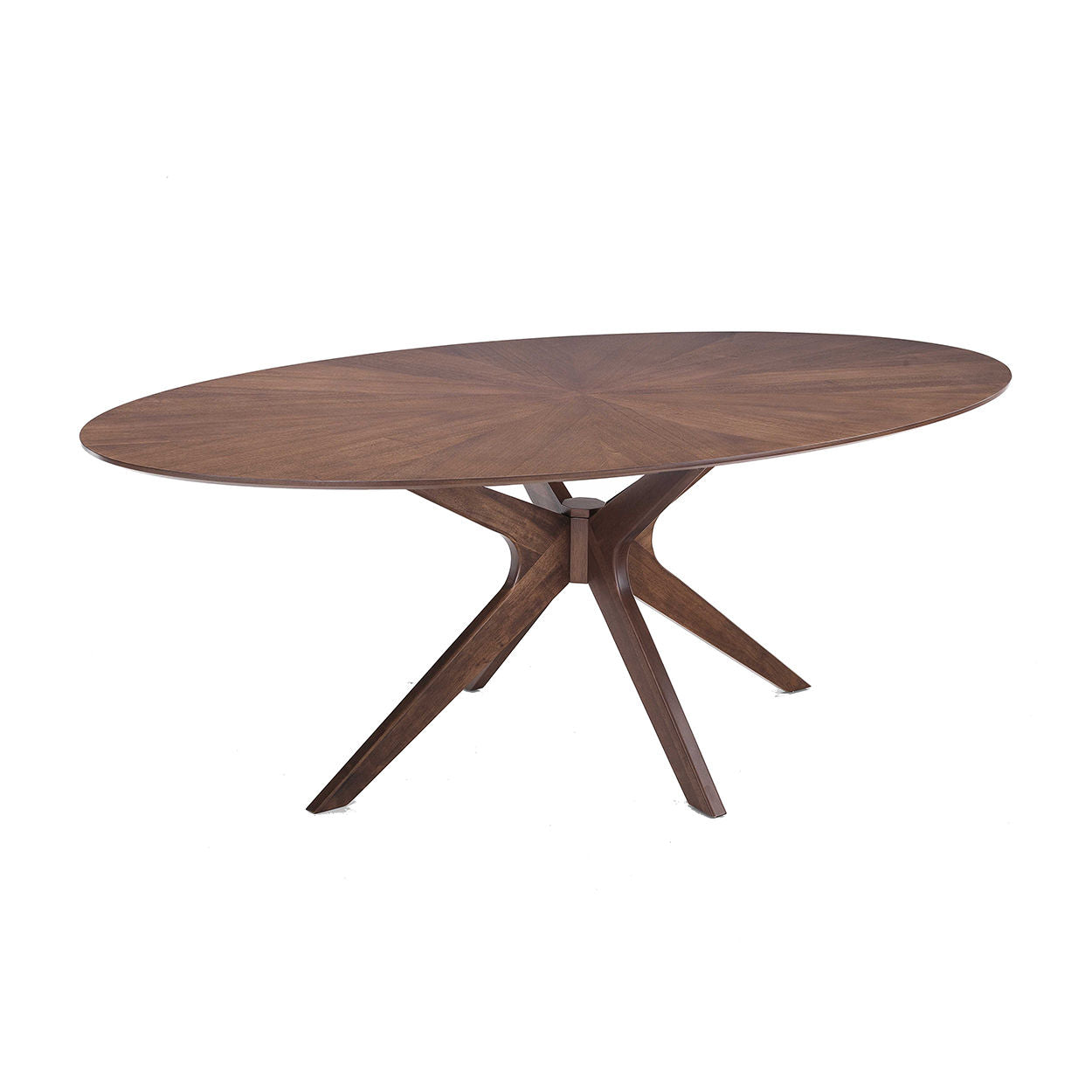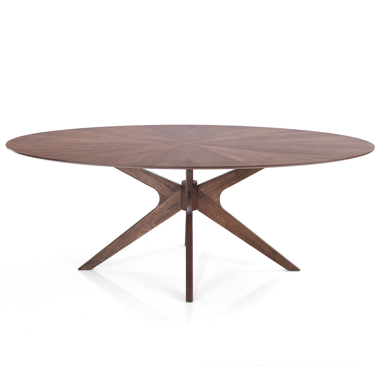 Tavolo design da salotto piacevole per la base con gambe incrociate e per il piano di forma ovale, la struttura in legno massello offre robustezza e solidità, mentre la finitura noce scuro accontenta gli amanti del legno tradizionale. Il tavolo è disponibile anche con una finitura rovere chiara dalla bellezza assoluta e insuperabile.
