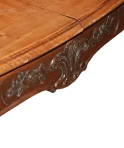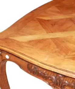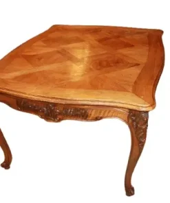 Tavolo quadrato allungabile francese della seconda metà del 1800 stile Provenzale in Legno di Rovere. Presenta motivi di intaglio su gambe e fascia sottopiano, piano parquettato 2 allunghe sotto tiro e piedini che terminano a ricciolo.