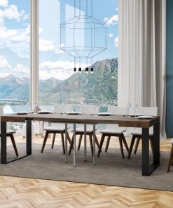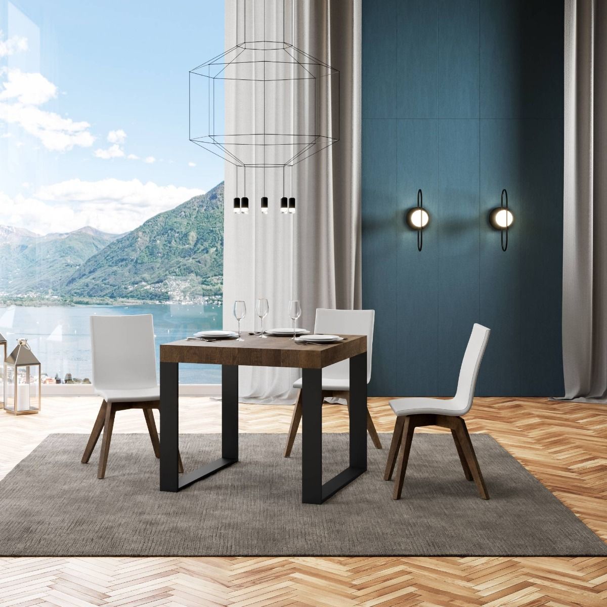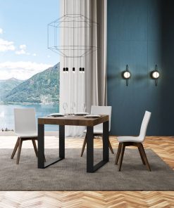 Tavolo da pranzo quadrato da cm 90×90 allungabile fino a cm 246 con 3 allunghe. Il nostro tavolo moderno è espressione di design minimale e stile industriale, grazie al connubio del metallo delle gambe e legno del piano.