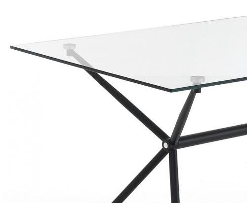 Tavolo design impiegabile come scrivania o tavolo da pranzo, dallo stile essenziale ed elegante, con base in metallo verniciato nero e piano in vetro trasparente.