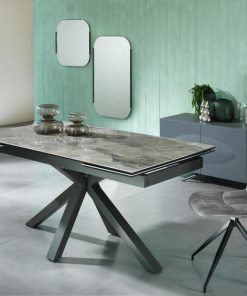 Tavolo da pranzo allungabile con elegante piano in ceramica e vetro temprato con finitura marmo. Distinto anche dalle gambe incrociate in metallo, il tavolo moderno si presenta anche funzionale grazie al suo meccanismo di estensione con due allunghe laterali da cm 40.