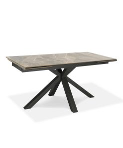 Tavolo da pranzo allungabile con elegante piano in ceramica e vetro temprato con finitura marmo. Distinto anche dalle gambe incrociate in metallo, il tavolo moderno si presenta anche funzionale grazie al suo meccanismo di estensione con due allunghe laterali da cm 40.