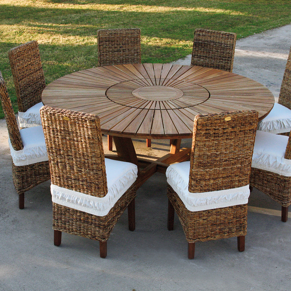 Tavolo da esterno tondo realizzato in robusto legno massello di teak indonesiano con finitura olio naturale, un modello tra i più prestigiosi e affidabili della categoria. Il tavolo presenta un caratteristico design con piano munito di parte centrale portavivande girevole, inoltre, anche la formidabile base spicca per bellezza e imponenza.