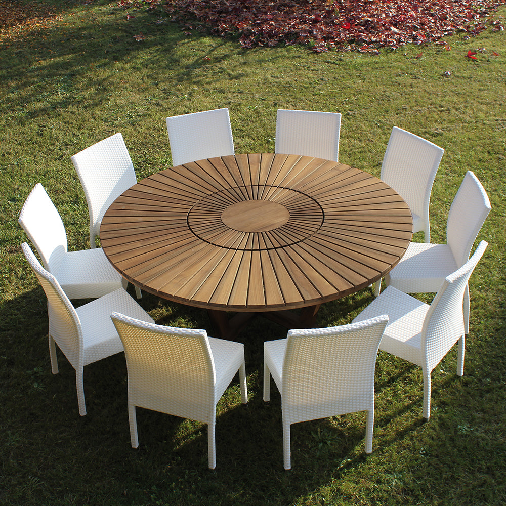 Il nostro tavolo rotondo, infatti, è realizzato con materiali e lavorazione specifici per resistere alle condizioni da esterno, offrendo legno massello di teak indonesiano con finitura olio naturale. Qualità a parte, il tavolo vanta anche una bellezza estetica come pochi, con bellissimo piano a listelli a raggiera e fornito di pratico portavivande centrale girevole. Anche la base sfoggia un particolare design, con legno curvato dalla robustezza visibile e tangibile.