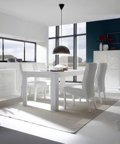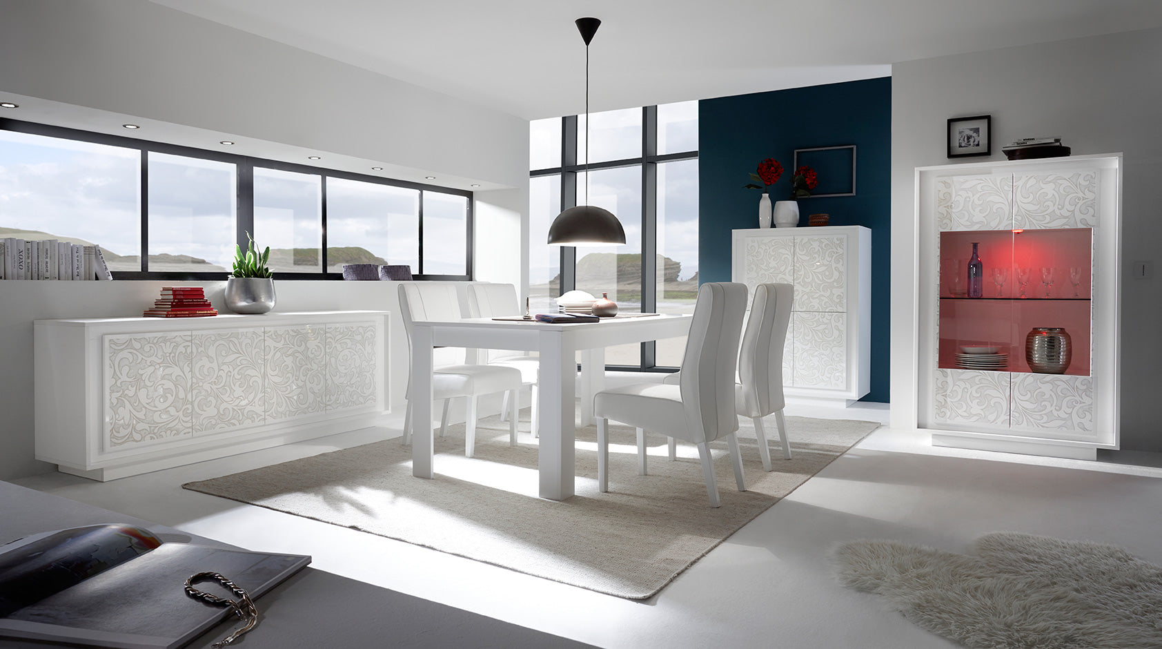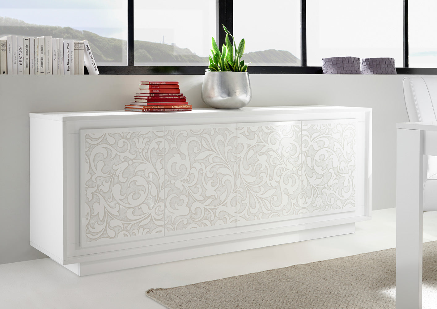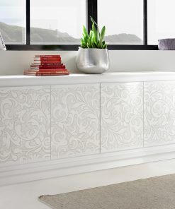 Teharan è formato da madia 4 ante, credenza alta, vetrina e tavolo con misure a scelta, tutto prodotto in legno bianco, ideale per stupire grazie all’eleganza espressa dalla bellissima fantasia con motivi floreali serigrafata che decora la parte frontale dei 3 mobili.