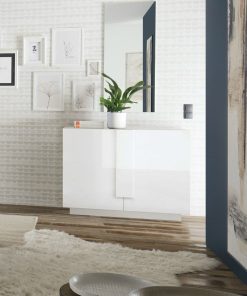 Sala moderna modello Telaviv, composta da tavolo da pranzo allungabile, credenza con 2 ante e madia alta con 2 ante e ripiani interni, tutti prodotti in legno bianco lucido. Il minimalismo delle forme è il tratto distintivo dei nostri mobili da soggiorno, definiti solo da una lunga maniglia che emerge e offre funzionalità in un facile apertura.