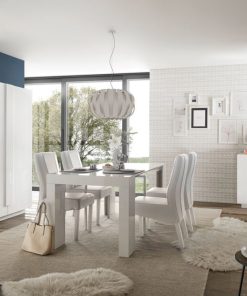 Sala da pranzo completa modello Telaviv, formata da tavolo allungabile da cm 137 a cm 185 grazie ad una allunga, credenza 2 ante e madia alta con 2 ante fornita di tanti scomparti interni. Realizzati in legno colore bianco lucido, il mobili del nostro soggiorno moderno viene incontro a diversi gusti grazie alla sobrietà e linearità dello stile, garantendo capienza e praticità.