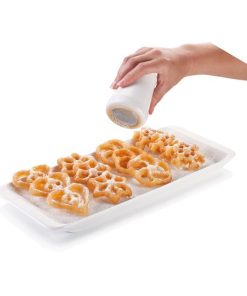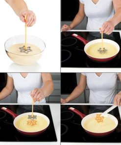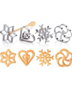 Il set contiene 4 stampi in metallo a forma di fiocco di neve, stella, cuore, fiore ed un manico removibile in nylon resistente al calore fino a 210 °C.