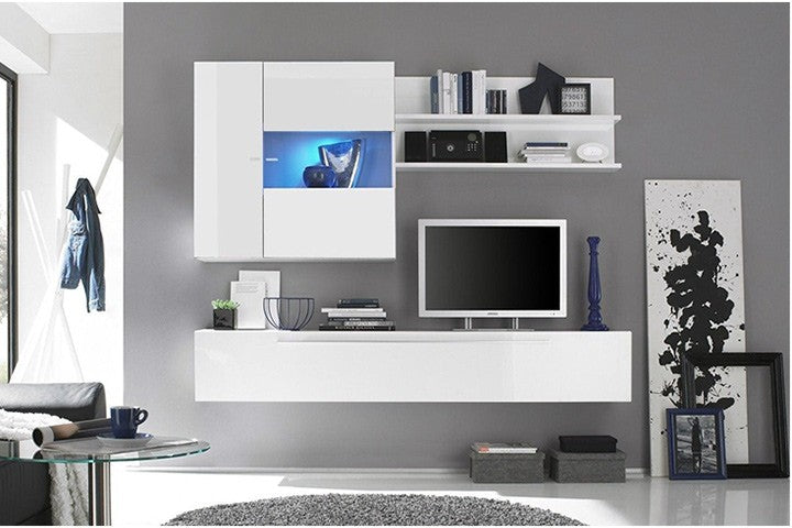 Parete moderna Teseo, con vetrina, pensile e doppia mensola, una soluzione semplice, compatta e funzionale.