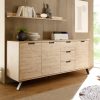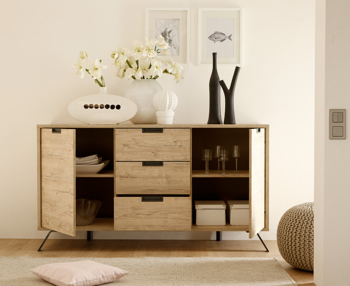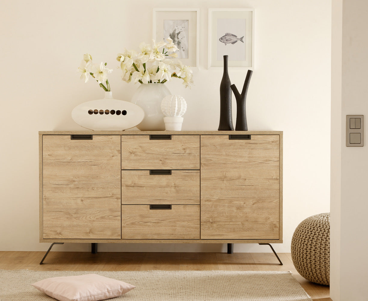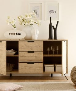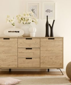 Credenza moderna con 2 ante e 3 cassetti, descritta da forme semplici, con finitura sherwood oak, una soluzione per chi apprezza l’aspetto naturale del legno.