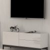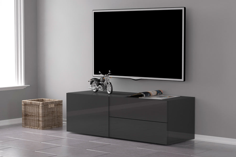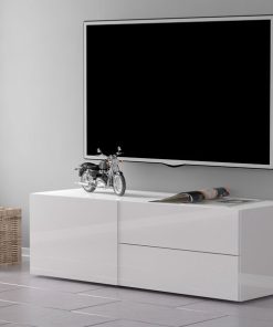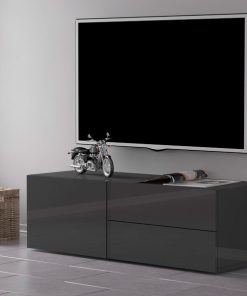 Mobile porta tv in legno, con anta e 2 cassetti, disponibile nella versione bianco lucido o antracite. La struttura è stata realizzata seguendo lo stile moderno, ideale per un arredamento stiloso, dando luce alla stanza. Una novità unica da non perdere!