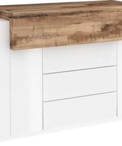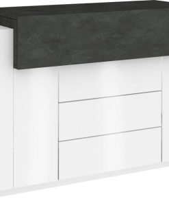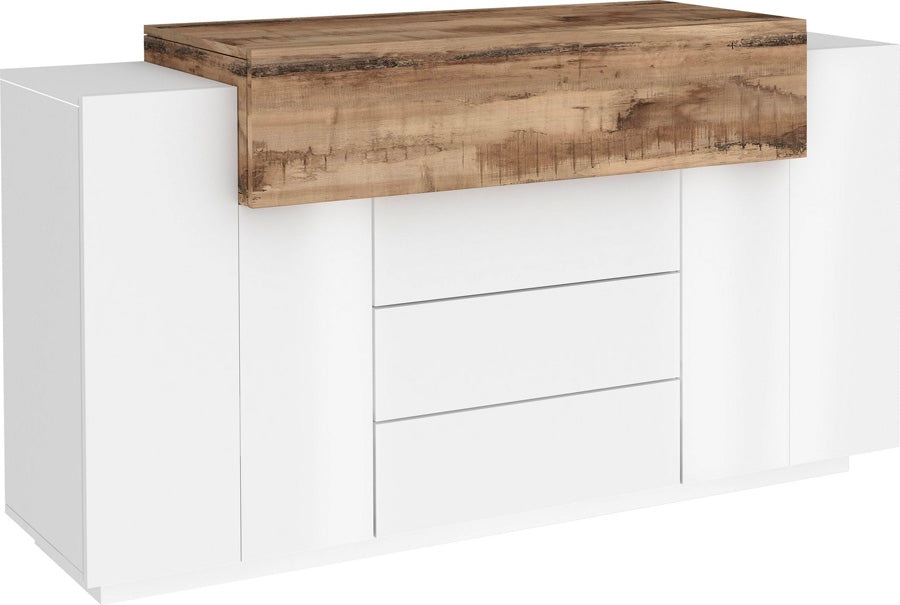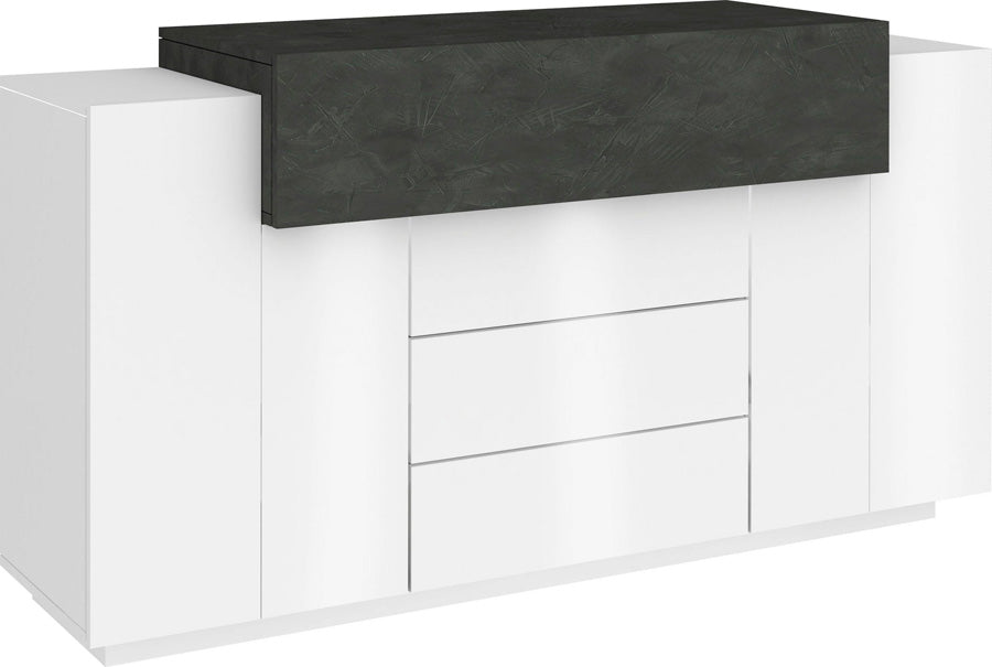 Straordinaria credenza realizzata interamente in legno, con struttura colore bianco lucido. Il mobile si presenta con 3 cassetti centrali e 2 ante ai lati. Particolare l’anta a ribalta sopra i cassetti, disponibile nella colorazione ossido o pero. Dal design moderno, questa madia è perfetta per essere collocata in soggiorno o sala da pranzo, un complemento unico e originale, per un arredamento di classe e attuale. Un prodotto Made in Italy e novità da non perdere!