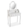 Toilette da camera realizzata in legno con 4 cassetti ed uno specchio dalla forma ovale. La finitura di colore bianco e la semplicità delle forme risalta uno stile classico e rende la toilette facilmente posizionabile nella tua camera. Utili i cassetti per riporre i trucchi ed averli sempre a portata di mano.