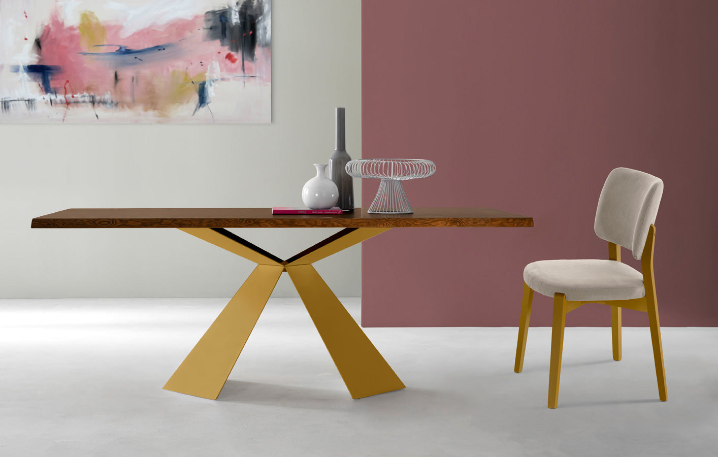 Esempio di design e qualiltà Made in Italy, il tavolo moderno Tokyo propone diverse finiture per la base tra cui l’elegante colore oro, mentre il piano è realizzabile in legno o vetro offrendo innumerevoli finiture da scegliere, in modo da definire autonomamente il proprio tavolo ideale.