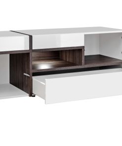 Il mobile tv Tomeo, infatti, fa parte di una linea di mobili da soggiorno contemporanei, con questo avvincente binomio bianco lucido e inserti in wengé che disegnano incastri geometrici interessanti. Tomeo non è solo bello da vedere, ma mette al servizio un ampio cassetto, due ante e un vano centrale illuminato con luce a led.