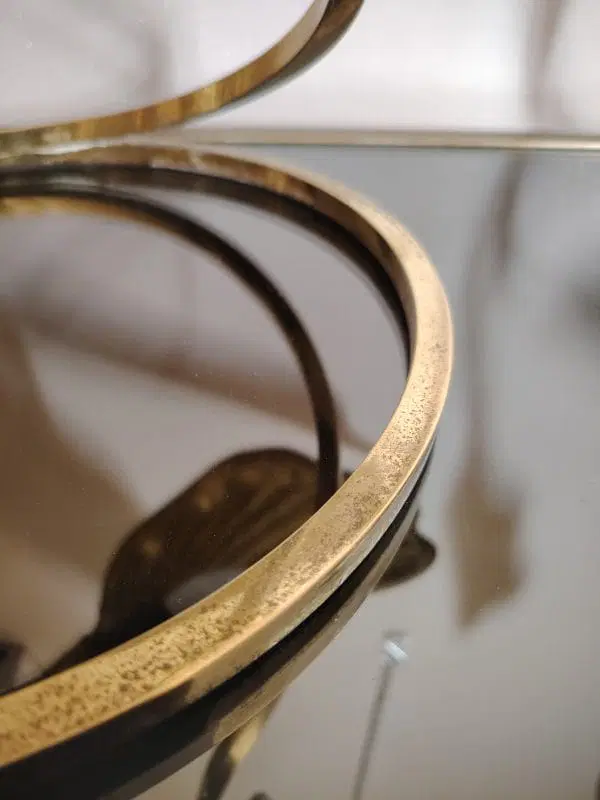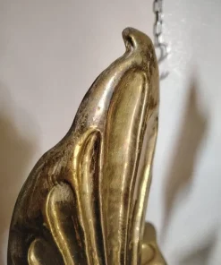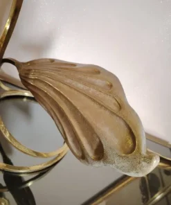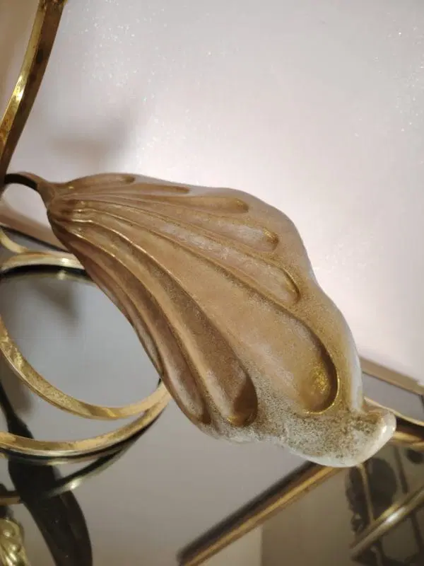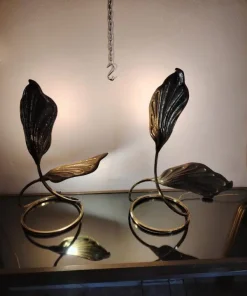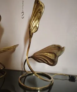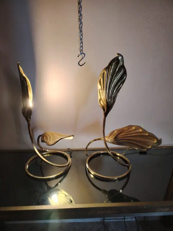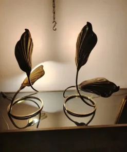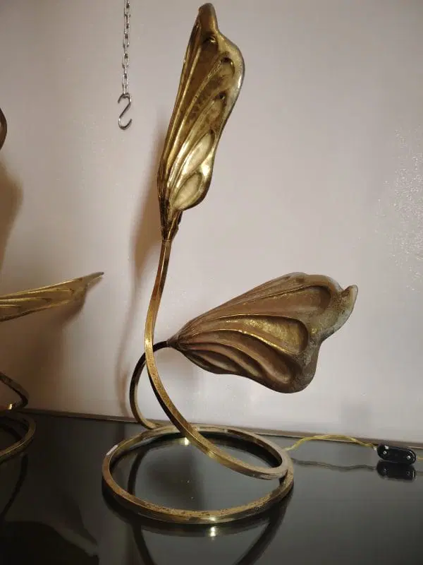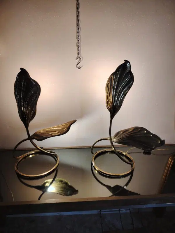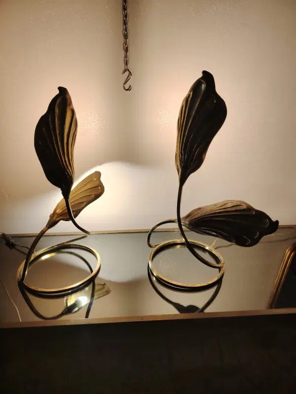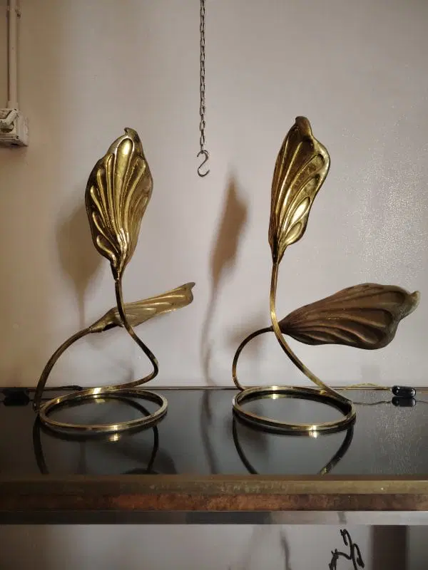 Rara coppia di lampade da tavolo anni 70 in ottone con foglie, disegnate da Tommaso Barbi per Bottega Gadda.