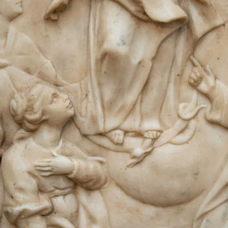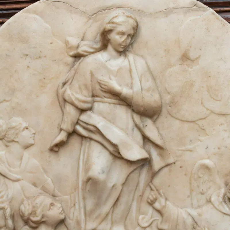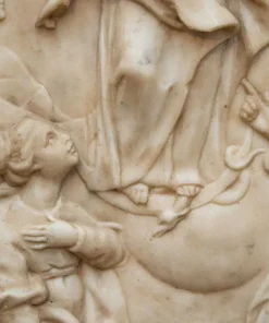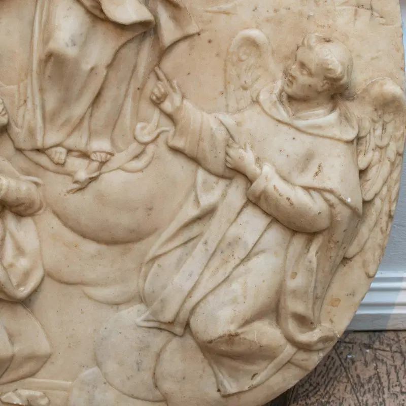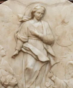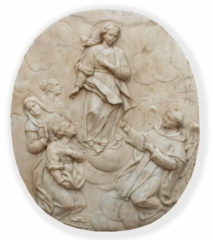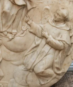 Al centro dell’ovale marmoreo troviamo un’Immacolata Concezione accompagnata da San Vincenzo Ferrer ( identificabile grazie alla presenza delle ali e dall’abito dei domenicani), e da due sante di difficile identificazione una delle quali con abito monacale.