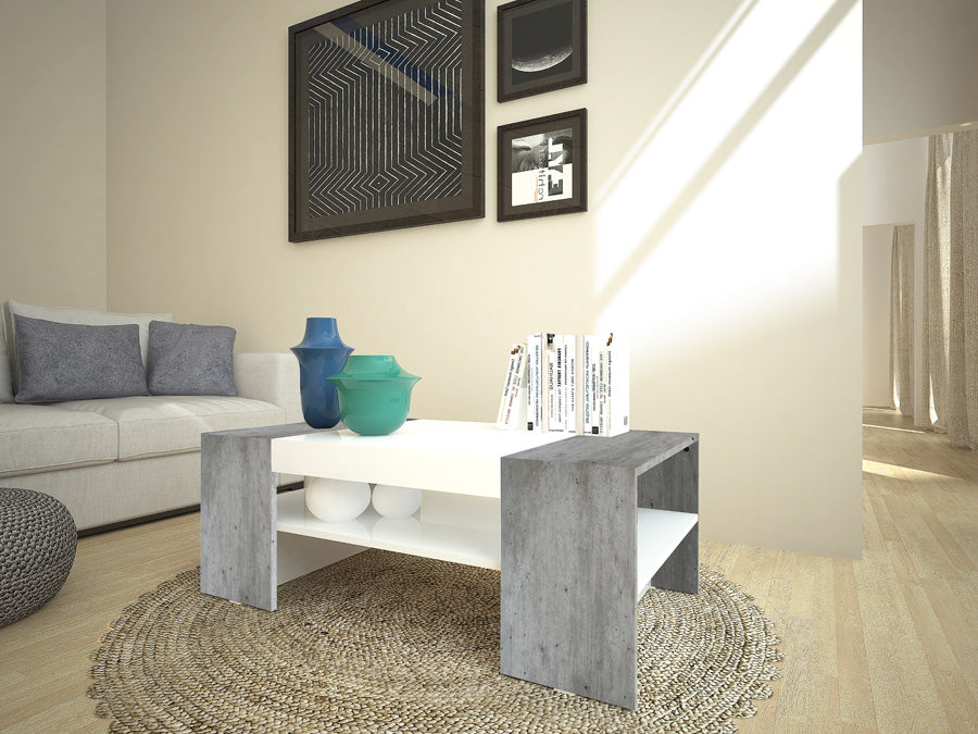 Tavolino da caffè realizzato in legno, disponibile in tre versioni di colore: bianco lucido e pero, o ossido, o cemento. Perfetto da collocare in salotto, la struttura si presenta con 2 ripiani di appoggio, il secondo ideale per riporre riviste e libri da leggere nel tempo libero. Il mobile, dal design moderno, dona eleganza e armonia alla vostra casa, offrendo un ambiente accogliente e confortevole per te e i tuoi ospiti.