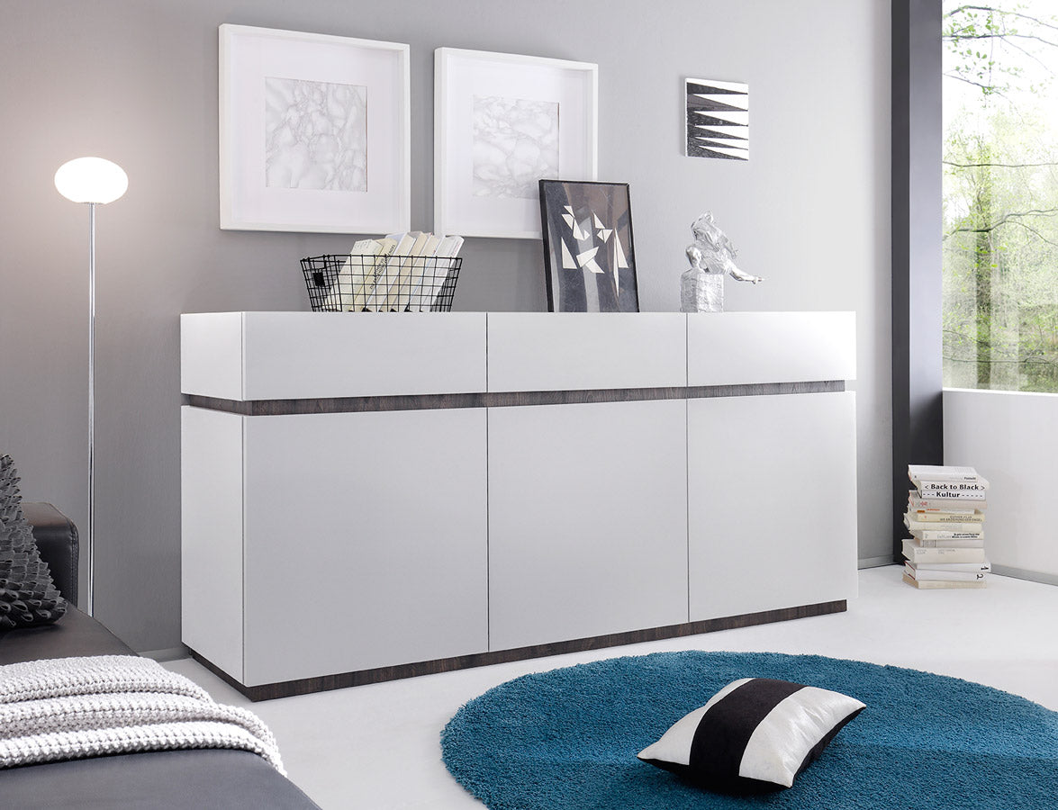 Credenza da soggiorno Vandella strutturata con 3 ante e 3 cassetti dal design sobrio e pulito, realizzata in legno bianco opaco con inserti wengè o bianco. Vandella fa parte di una linea di mobili per living Made in Italy, dallo stile minimale e strutturalmente validi e funzionali.