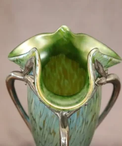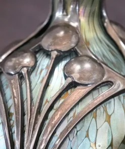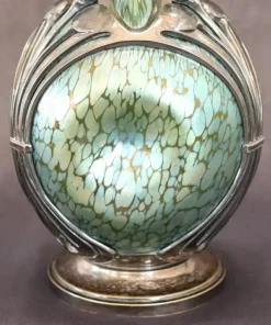 Importante vaso da esposizione museale del pieno periodo Art Nouveau. Grande vaso a manico in vetro di Boemia con decorazione metallica in rilievo e cesellata in stile Art Nouveau. Il vetro presenta un decoro “Papillon” molto particolare: un vetro trasparente verde con inclusioni e iridescenze giallo-argento. Questo importante vaso è il risultato della collaborazione tra Moritz Hacker (Budapest 1849-1932), gioielliere di corte, e Johann Loetz Witwe, importante produttore di vetro artistico di Klostermühle, in Boemia, Austria-Ungheria. Le opere di Johann Loetz sono tra i più importanti esempi di Art Nouveau. Il vaso presenta il marchio di Moritz Hacker sotto la base.