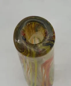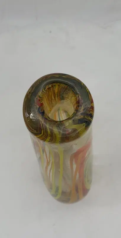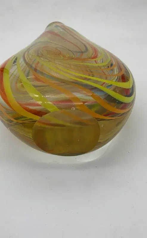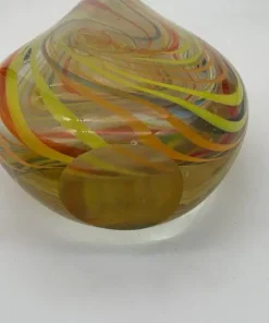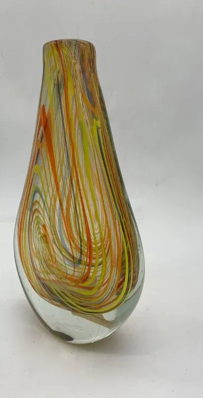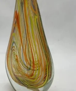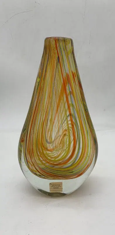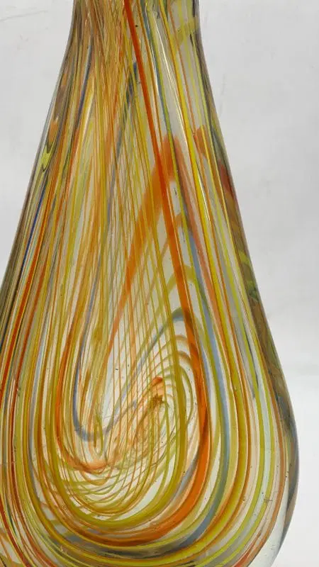 Vaso artistico in vetro di Murano prodotto da Seguso Vetri d’Arte, celebre manifattura veneziana, realizzato con la tecnica del “sommerso” e decorato con vivaci bacchette vitree a spirale. La forma a goccia, elegantemente slanciata con base ampia e bocca stretta e liscia, conferisce al pezzo un equilibrio visivo tra leggerezza e stabilità. L’interno è attraversato da una fitta trama di filamenti multicolori – arancio, giallo, verde, blu e rosso – che si rincorrono in volute fluide e dinamiche, conferendo profondità e movimento all’oggetto. Lo spesso strato di vetro cristallino che avvolge le decorazioni interne ne amplifica l’effetto tridimensionale e la brillantezza. Il vaso è firmato con etichetta originale “Seguso Vetri d’Arte – Murano”, garanzia di autenticità e maestria artigianale. Ideale come pezzo decorativo da collezione, incarna la perfetta sintesi tra arte, design e tradizione vetraria muranese del Novecento.