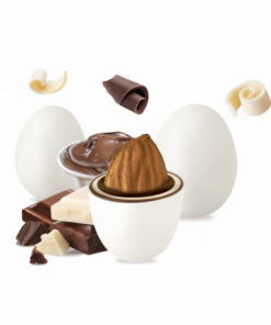 Mandorla tostata ricoperta da cioccolato fondente e bianco e da un sottile strato di zucchero.