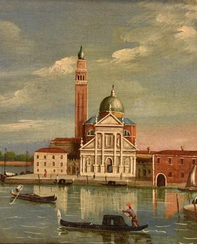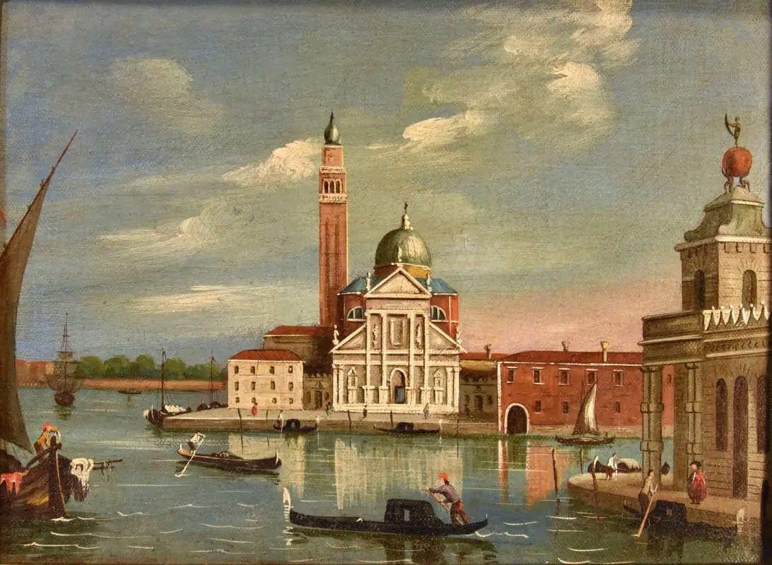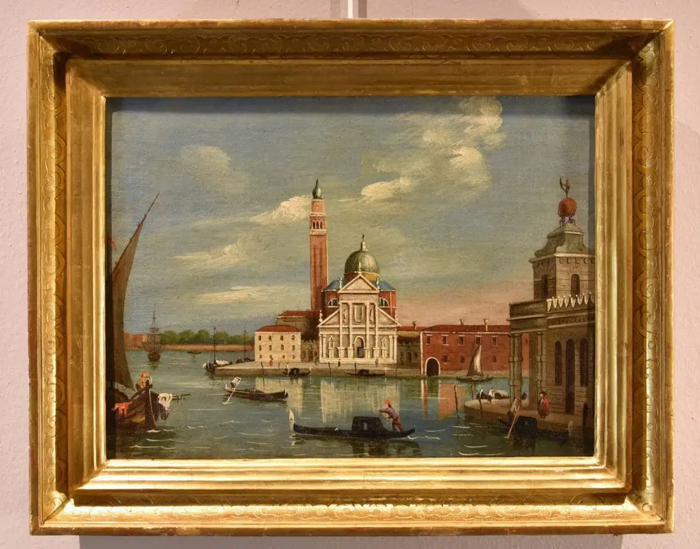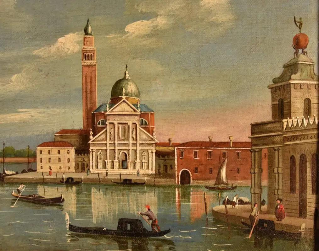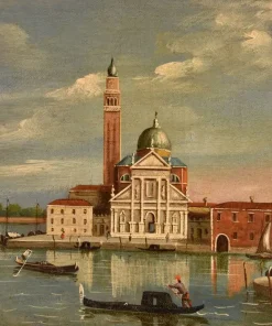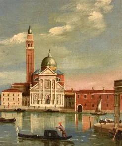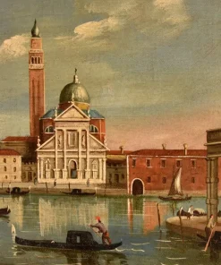 Si tratta di uno scorcio molto interessante di Venezia, una veduta dell’Isola di San Giorgio Maggiore, situata di fronte a piazza San Marco e bagnata dal canale della Giudecca e dal canale di San Marco. Al centro si erge maestosa la facciata della Basilica di San Giorgio Maggiore, progettata da Andrea Palladio, elemento essenziale del panorama osservabile dalla piazzetta di San Marco e in molti quadri di vedutisti.