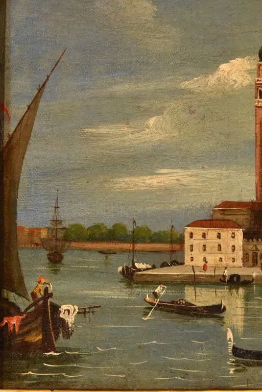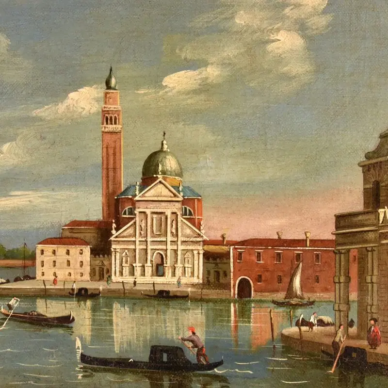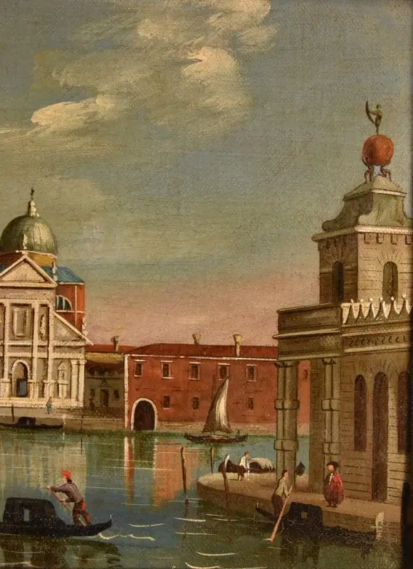 Il dipinto, con le sue pennellate precise e le architetture definite in miniatura con buona tecnica vedutistica, è da inserire nella tipica produzione di vedute degli artisti che si ispiravano alla lezione del grande Antonio Canal ’il Canaletto’ (1697-1768), punta di diamante del vedutismo settecentesco.