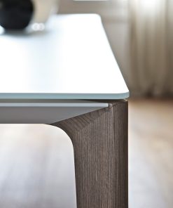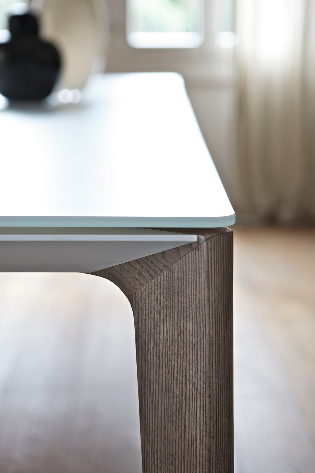 Tavolo allungabile da pranzo Versus Bontempi da cm 160 estensibile fino a cm 240, con due allunghe riposte sotto il piano. La particolarità estetica del tavolo moderno Versus è incentrata sulle gambe dagli angoli arrotondati realizzate in legno massello, che potrai scegliere tra 5 finiture. il piano è disponibile in cristallo o supermarmo.