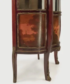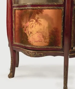 corpo mosso con vetri sui tre lati, fronte ad un’anta con parte inferiore raffigurante una scena galante, fregi in bronzo dorato a motivi fogliati, sulla cimasa un decoro a conchiglia, gambe leggermente sagomate, cm 171x83x40 (lievi difetti)
