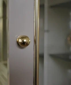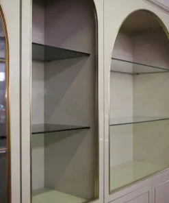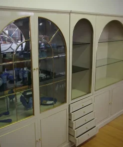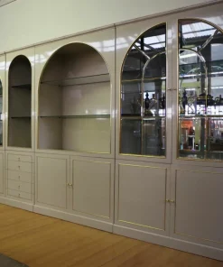 Mobile vetrina ad arco in legno laccato, mensole in vetro, profili e pomoli in ottone ottone di Mario Sabot anni ‘70.