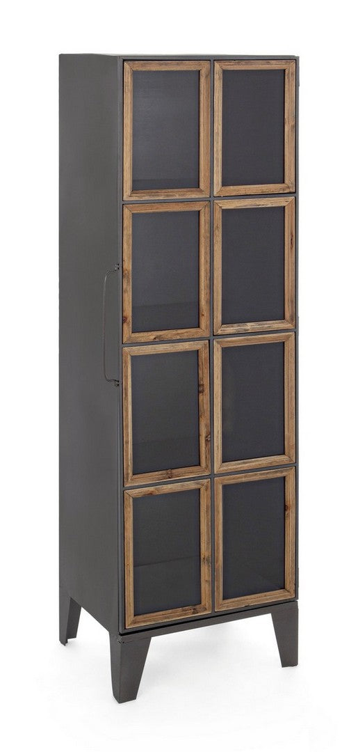 Vetrinetta a colonna con 1 anta, facente parte di una serie di vetrine in stile industriale. Questo particolare modello di vetrina si caratterizza per gli inserti in legno colore naturale che spiccano sull’anta, interamente realizzata in acciaio dal colore scuro.