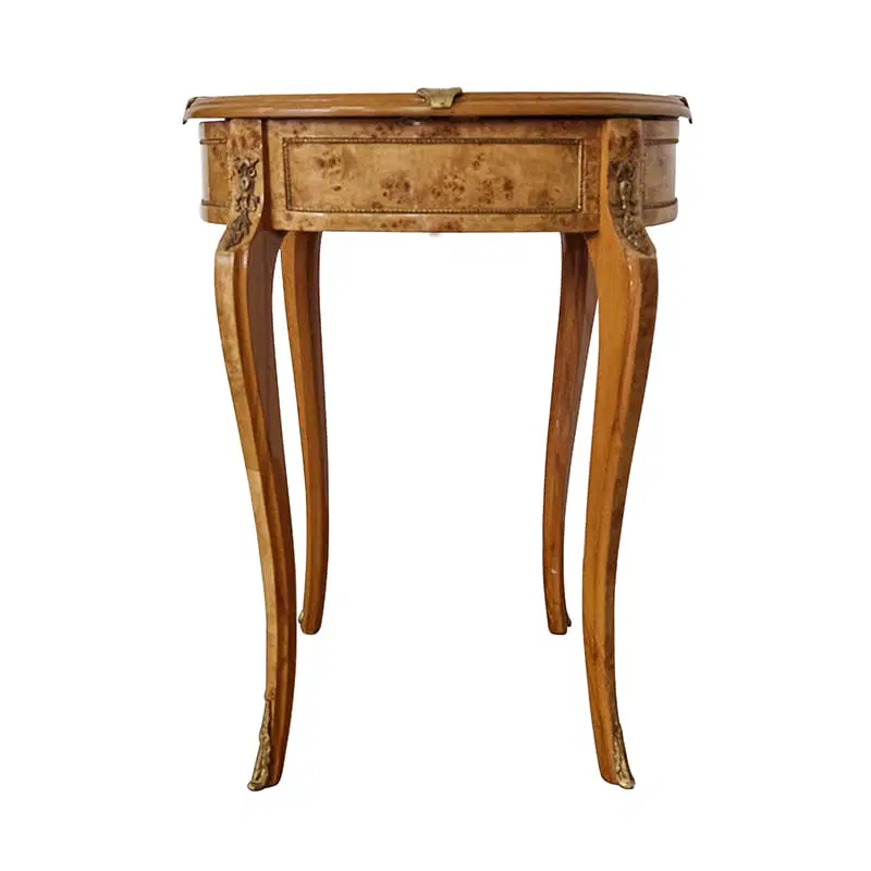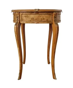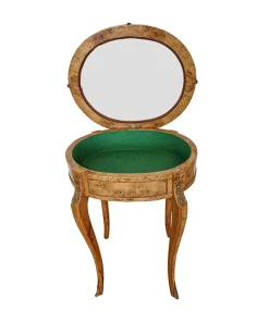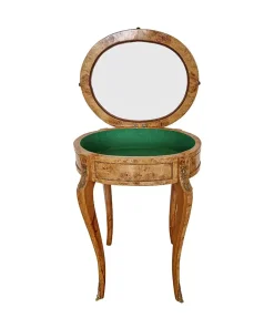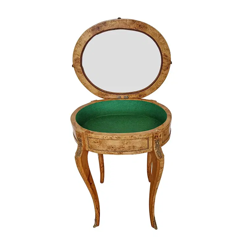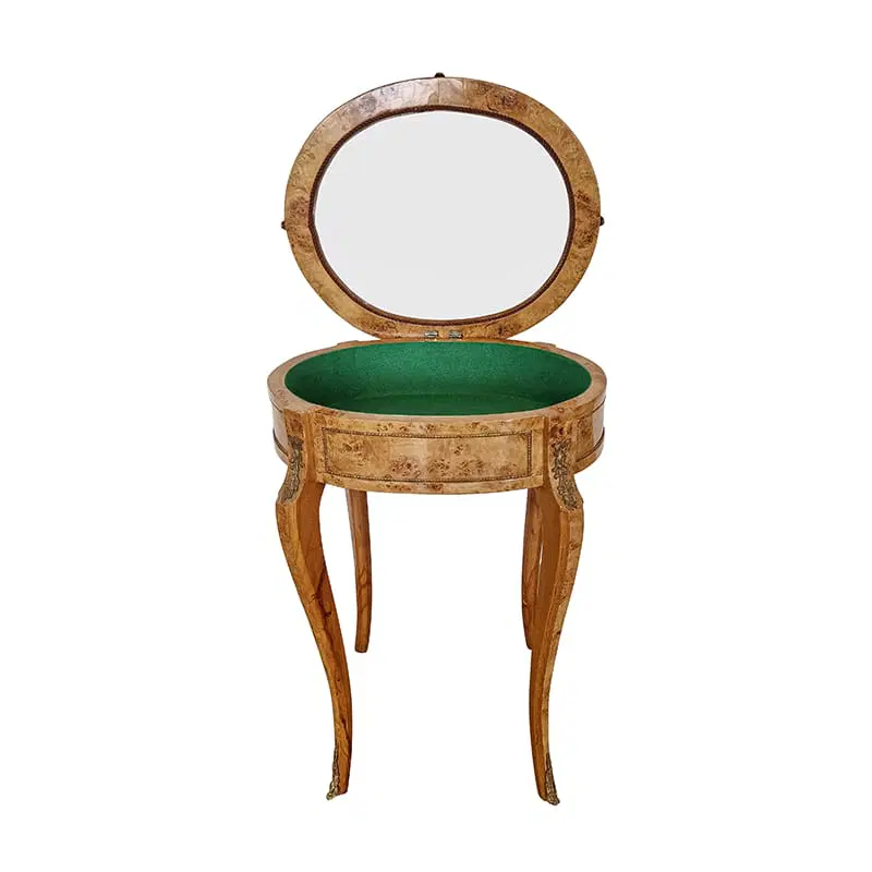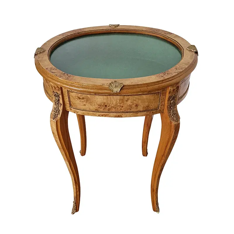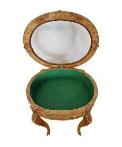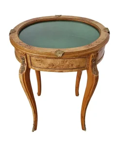 Vetrinetta in stile Napoleone III con piano in vetro e struttura in radica di betulla . Inserti in ottone e rivestimento interno in panno verde