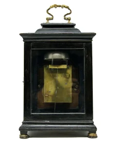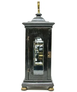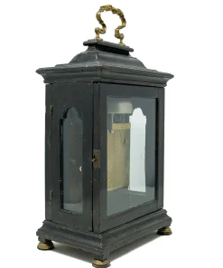 Orologio da tavolo in legno ebanizzato con applicazioni in bronzo dorato, di forma architettonica con maniglia serpentinata che si diparte dalle cima. Presenta una cassa centinata con quadrante in lamina di metallo con numeri romani per le ore e numeri arabi per i minuti, oltre ad un doppio foro di carica. Agli angoli è inquadrato da fregi vegetali in bronzo dorato, simbolo del rinnovato naturalismo che coinvolge la manifattura viennese all’inizio del XIX secolo.