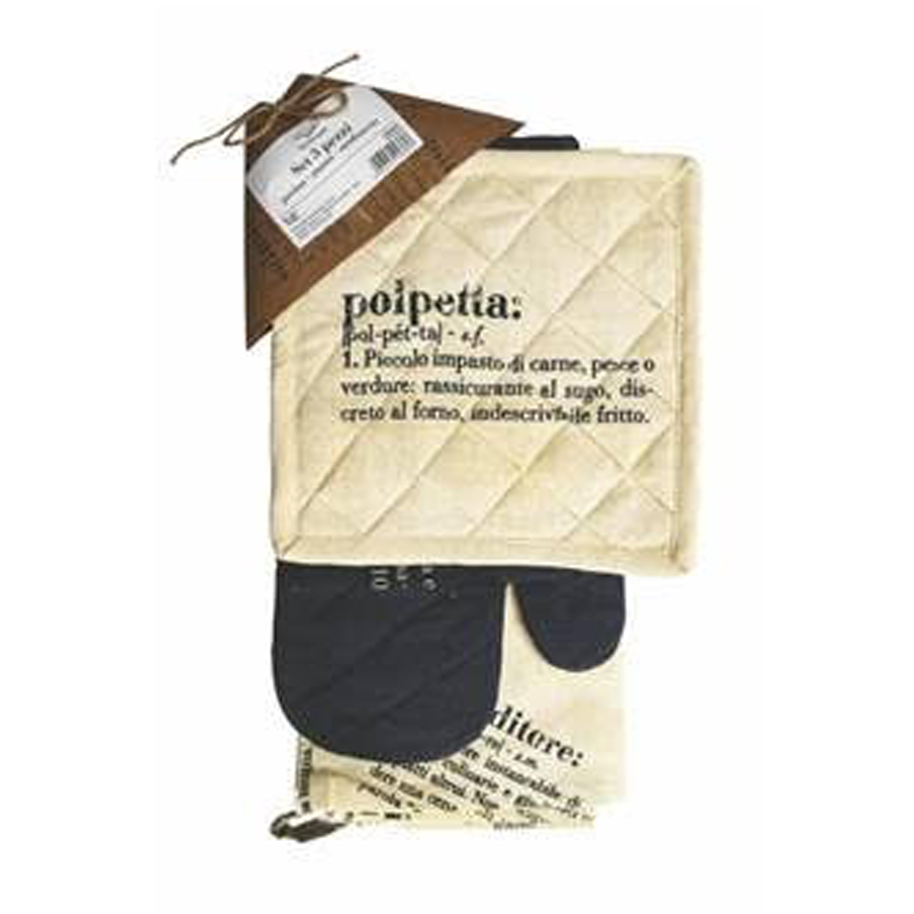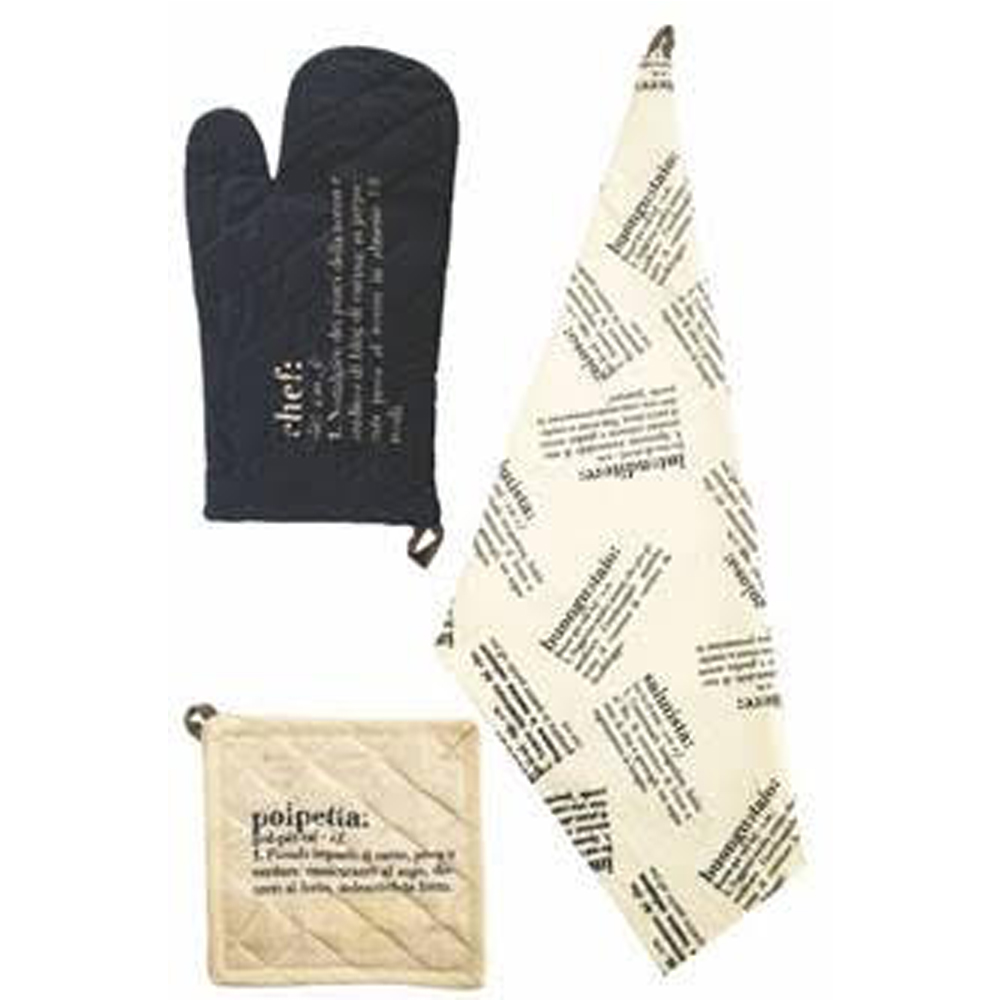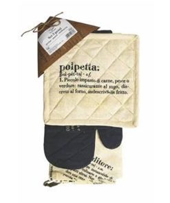 Il set si compone di: presina, gaunto da forno e strofinaccio