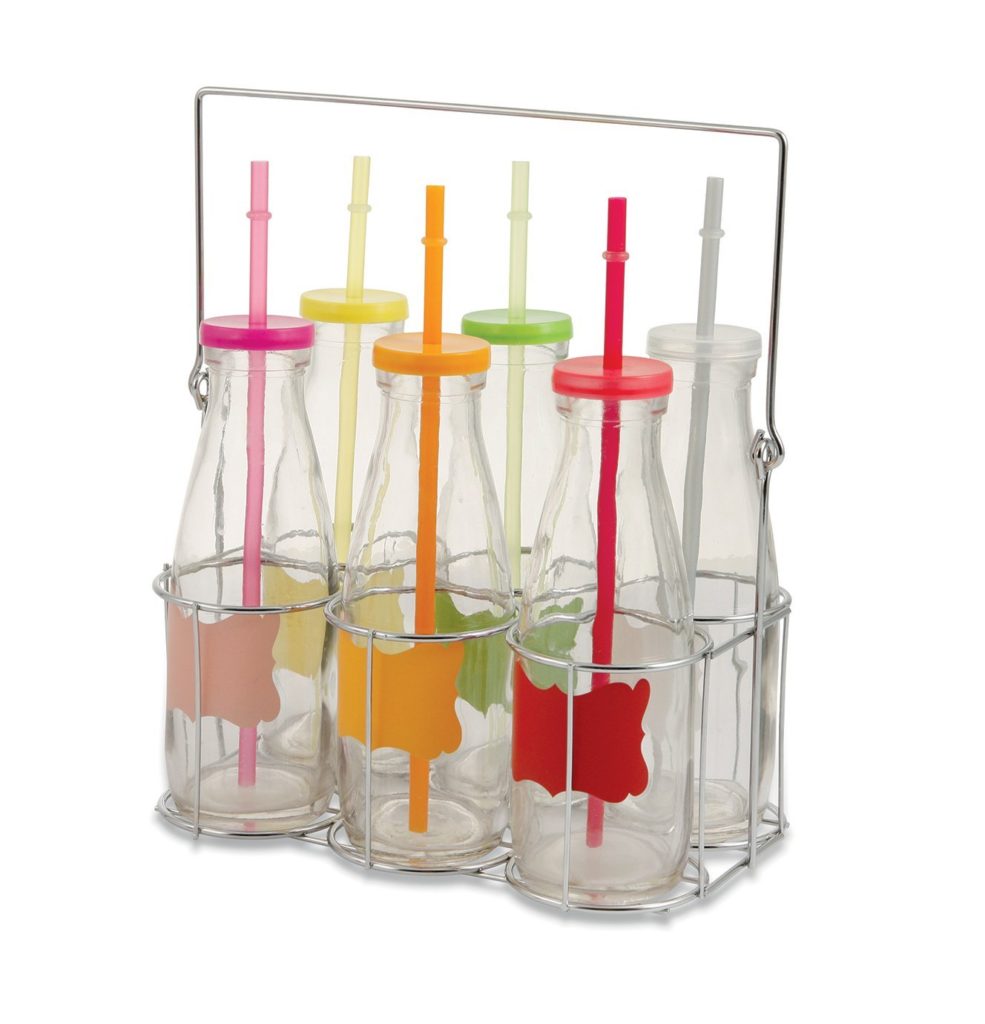 Set composto da 6 bottiglie in vetro con stand in ferro