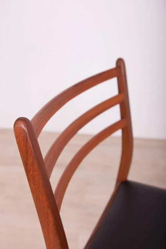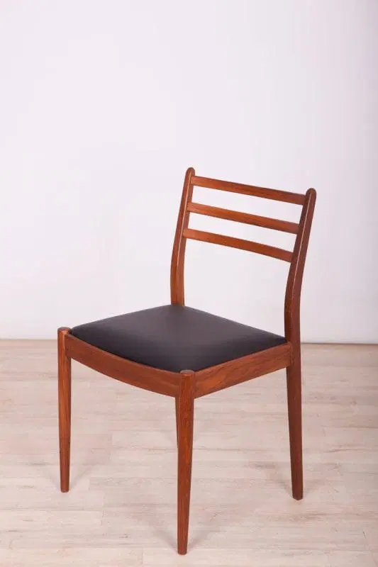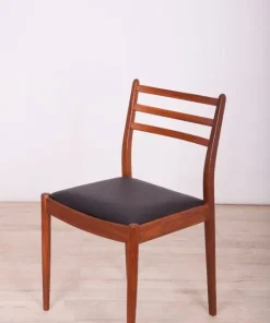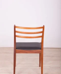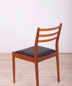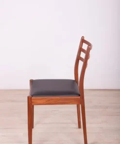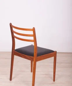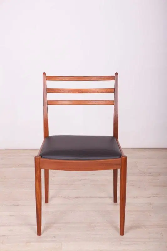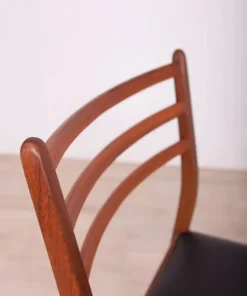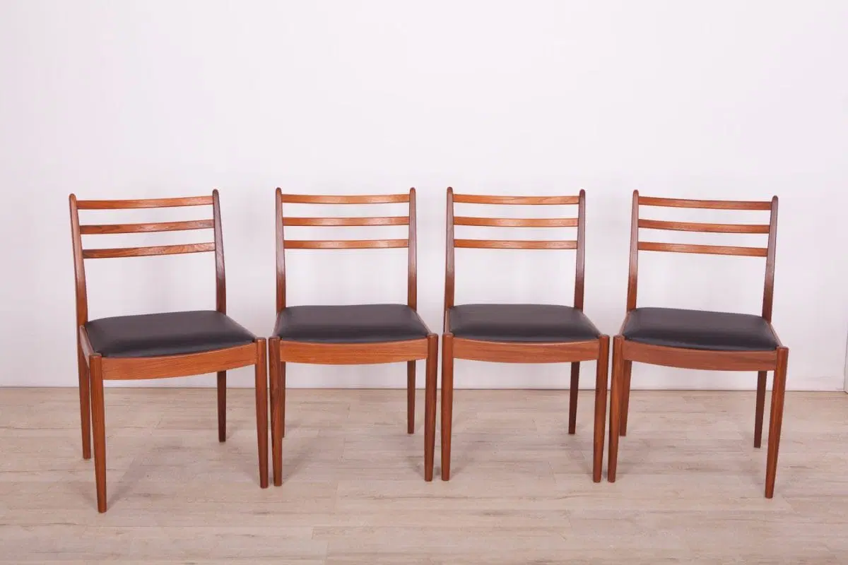 This set of four dining chairs was produced by G-Plan in the United Kingdom circa 1960. It was designed by Victor Wilkins. The frames are made of teak and the seats have been reupholstered with new black leather. The teak elements have been cleaned and polished with Danish oil.