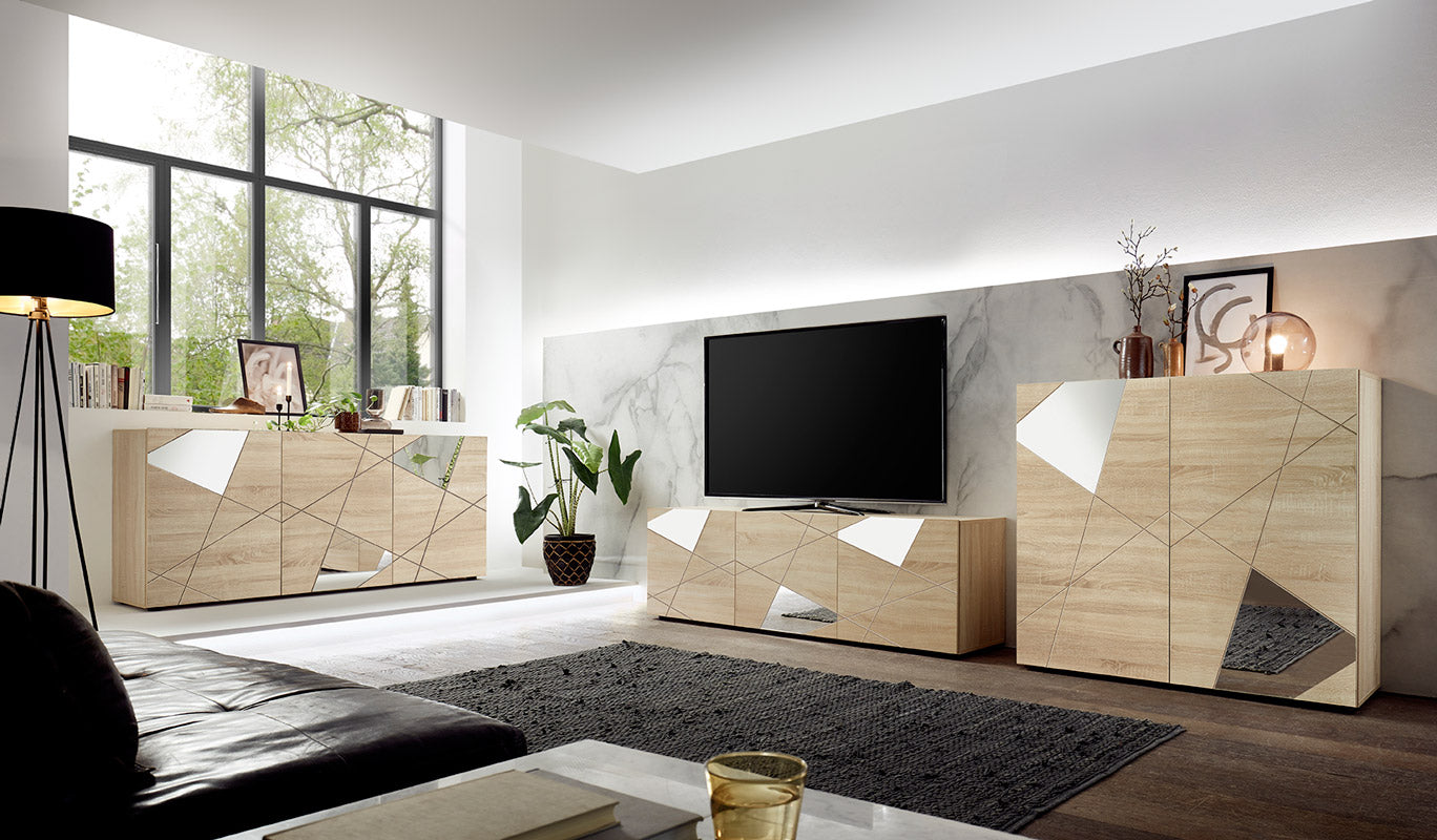Soggiorno completo moderno con mobile porta tv e madie in legno rovere con serigrafie e specchio