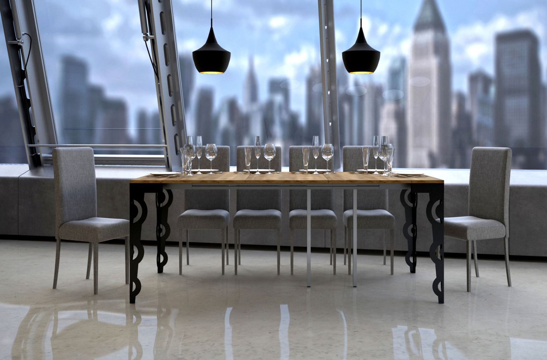 Consolle allungabile modello Vittorian Evolution, prestigiosa, elegante e funzionale, distinguibile grazie alle particolari gambe in metallo lavorate colore antracite. Il piano è realizzato in legno quercia natura e può giungere ad una lunghezza di cm 300, grazie a 5 allunghe incluse.