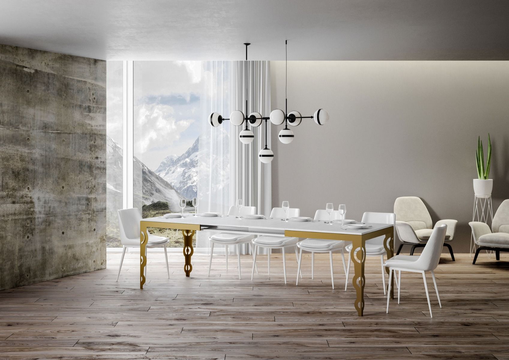 Non finirai mai di stupirti per la bellezza e l’originalità del tavolo design Vittorian Evolution, costitutito da piano allungabile in bianco lucido e struttura in due colori a scelta: antracite o oro.