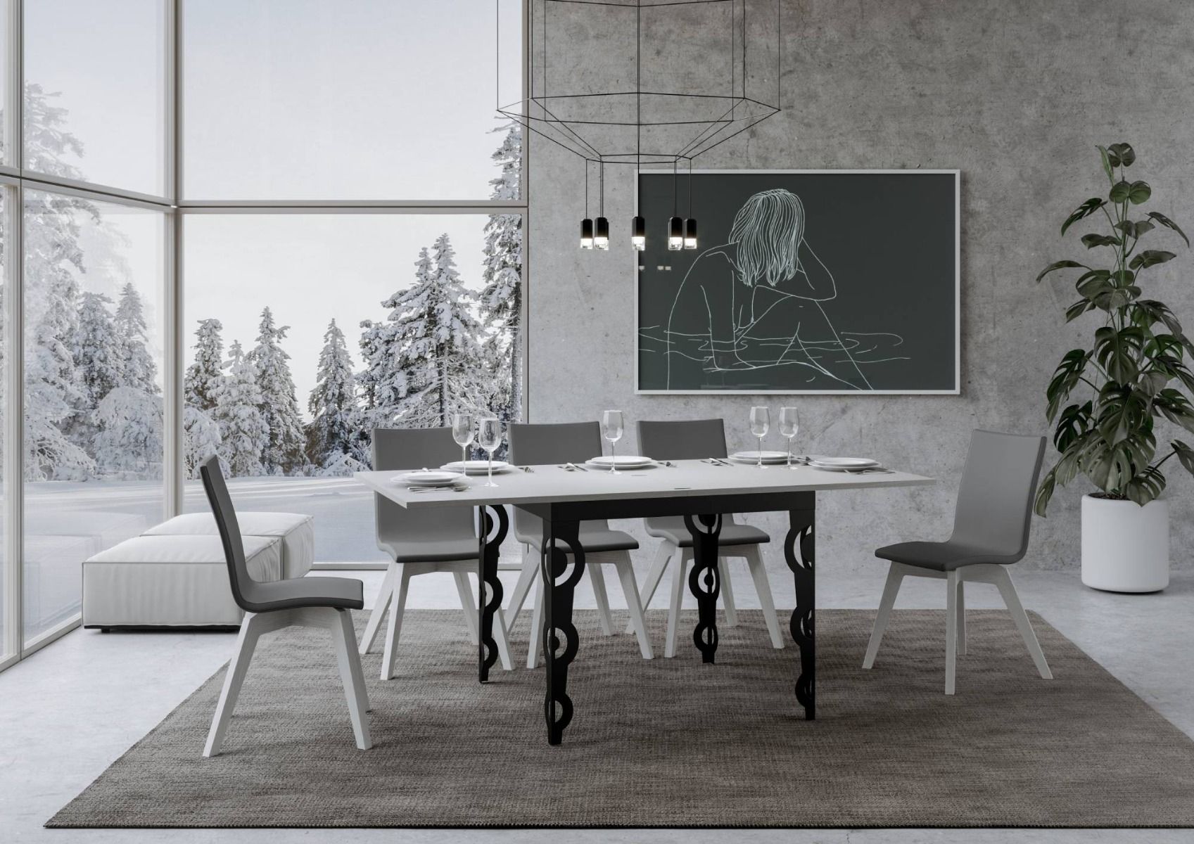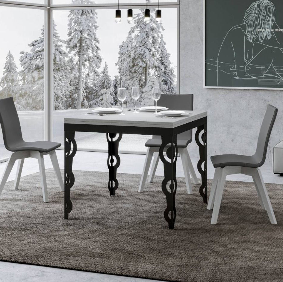 Tavolo quadrato di design Vittorian versione Libra, ossia con piano da cm 90×90 che si apre a libro, raggiungendo una lunghezza di cm 180. Il nostro tavolo da pranzo conquista per il particolare design delle gambe con cerchi forati, realizzate in metallo colore antracite. Vittorian Libra è ideale per chi cerca eleganza e originalità, con diverse finiture disponibili per il piano come bianco frassino, quercia, cemento o noce.
