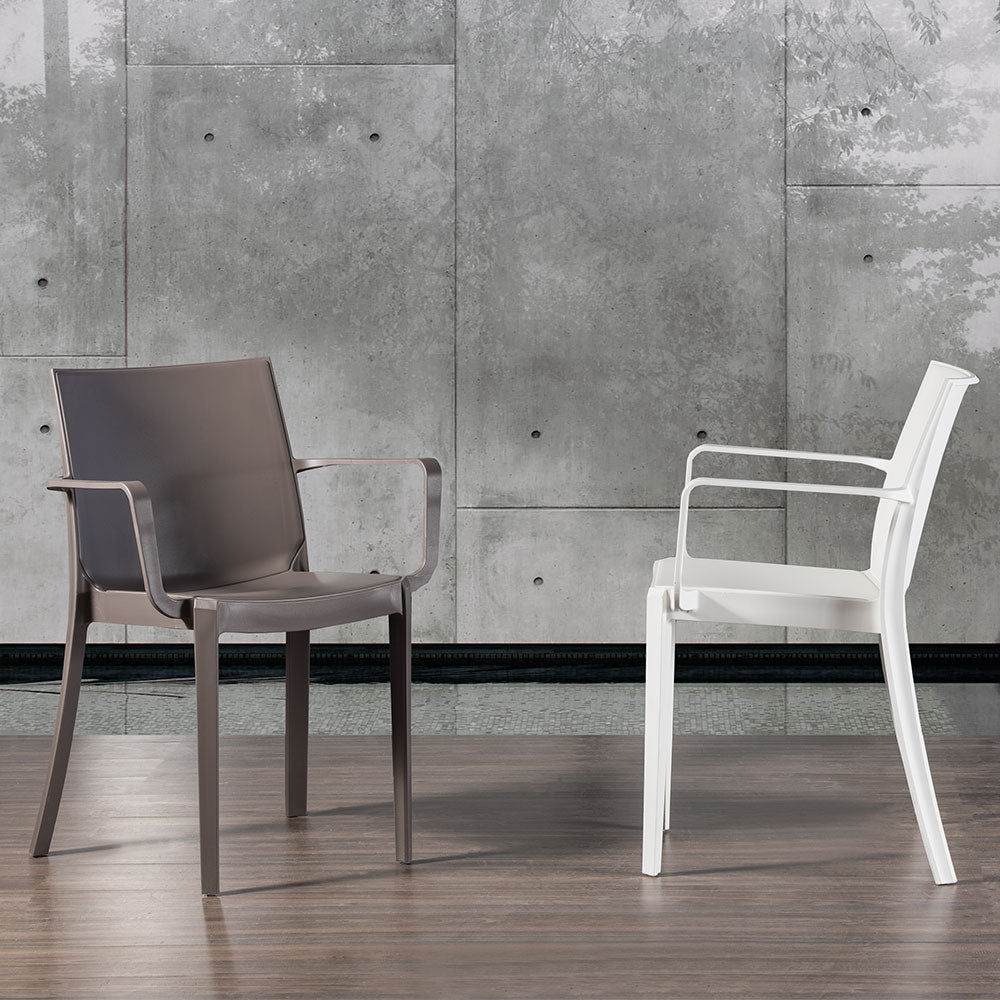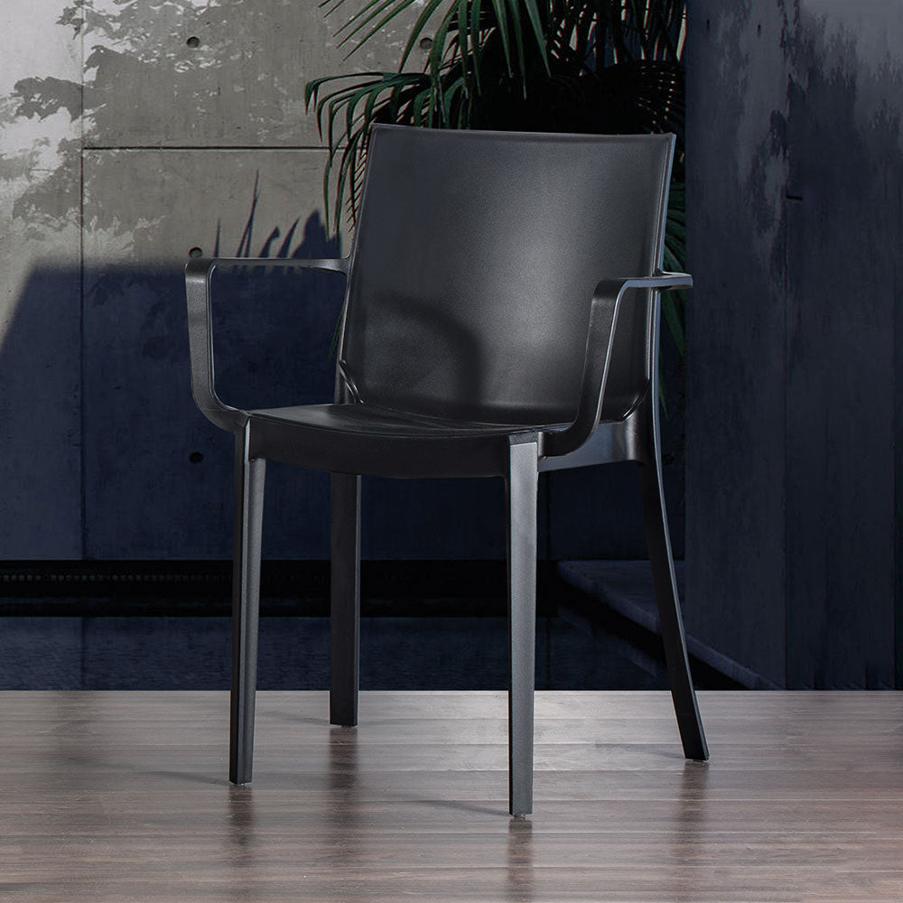 Poltroncina moderna con braccioli realizzata in polipropilene, una soluzione versatile e utile per arredare sia il soggiorno o sala pranzo, sia spazi all’aperto, adatta anche da uso contract.