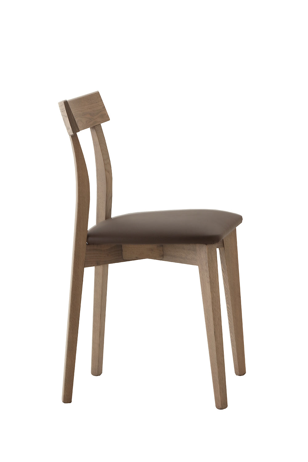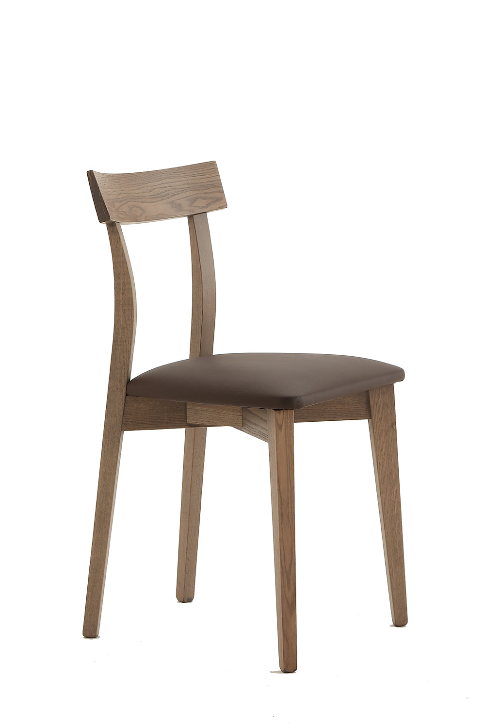 Sedia dal design classico realizzata in legno frassino massello con particolare finitura noce e comodo sedile imbottito e rivestito in pratica ecopelle colore moka.