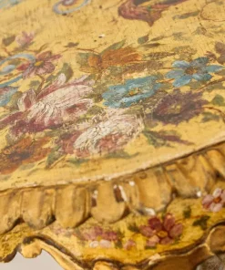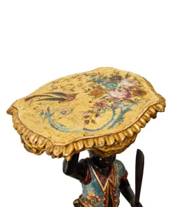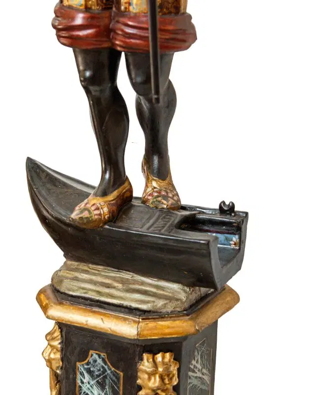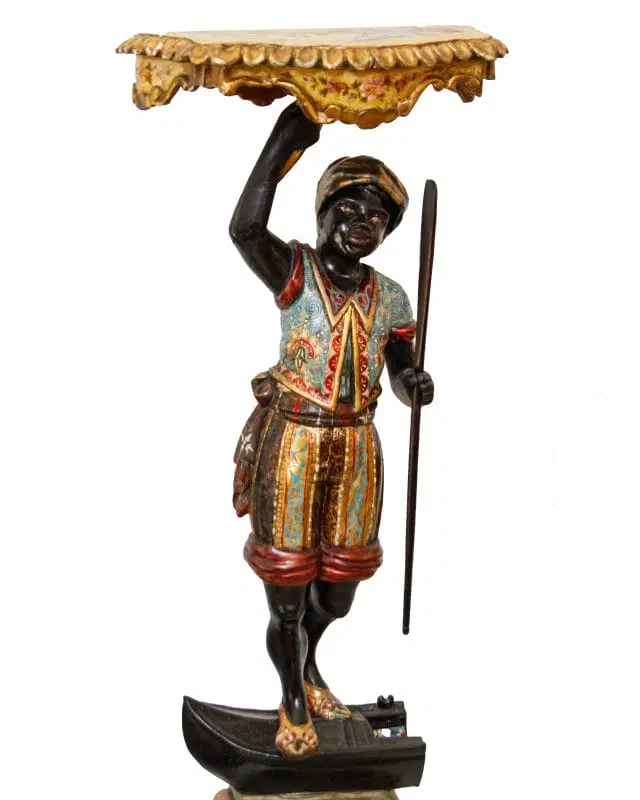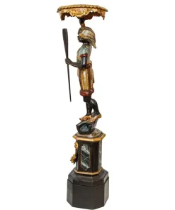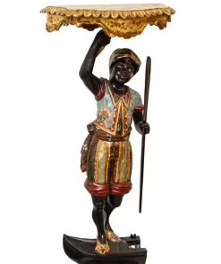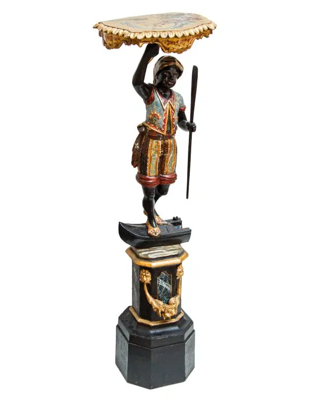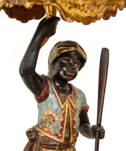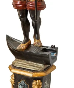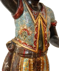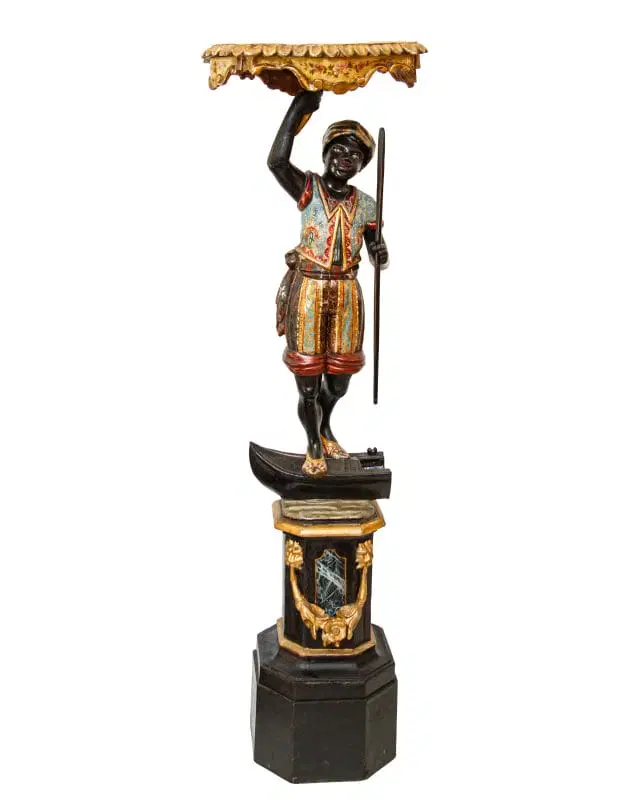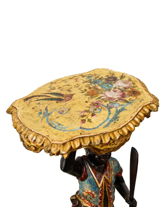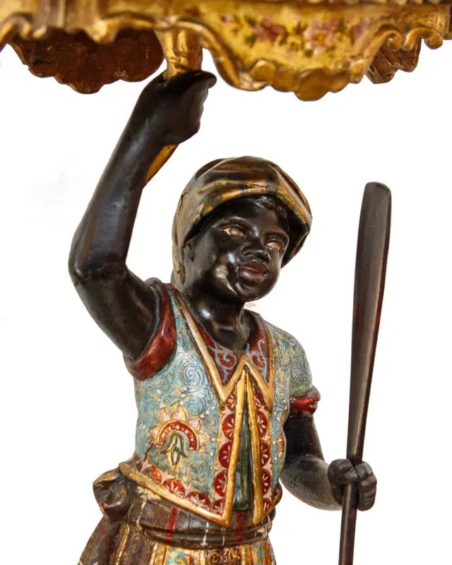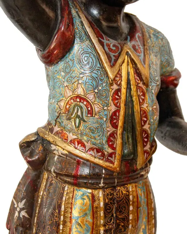 Il fascino per la cultura mediorientale, evidente nella produzione scultorea rappresentante moretti e odalische, acquisisce nel presente esemplare una carica di esotismo massima. Il moretto, abbigliato di splendidi abiti broccati e riccamente decorati, muove un piede nell’accennare un passo, controbilanciandosi, al contempo, con il fianco destro; il voluminoso nodo fissato sul bacino, da cui piovono ornati drappeggi, contribuisce a rinvigorire la parte centrale della scultura, rinforzandola visivamente per sostenere otticamente meglio il ripiano posto sulla sommità. La figura, che indossa babbucce tipicamente orientali, è in equilibrio su una gondola. La sottile policromia che illumina il moretto segue tremula e sfavillante i pieni e le rientranze dei rilievi, movimentando le apparenze, al pari dello stacco visivo offerto inoltre dall’oro rispetto al fondo scuro ligneo. La diffusione di moretti reggicero, reggipiano, a mezzo tondo in quanto parte di mobili e simili si colloca nel tradizionale percorso di autocelebrazione delle potenze europee, elogianti le proprie vittorie militari attraverso una strumentalizzazione figurale dell’immagine delle popolazioni vinte. La presente scultura esacerba il fascino orientale della cultura “altra” scegliendo di raffigurare il moretto non soltanto con abiti locali ma, attraverso una commistione culturale, offrendo allo spettatore il fascino dell’edulcorato mondo orientale.
